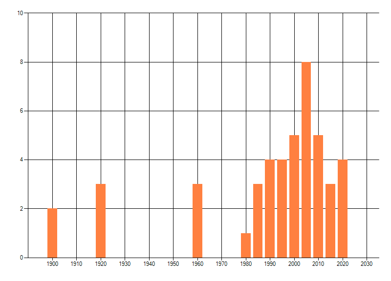 Het aantal atlasblokken (5x5 km) waarin de soort is gemeld binnen een periode van vijf jaar (vanaf 1980) of twintig jaar. Niet gecorrigeerd voor waarnemersinspanning en het aantal doorgegeven waarnemingen kan sterk variëren per periode, dus een trend in verspreiding kan hier niet direct uit worden afgelezen. Het opgegeven jaartal is het eerste jaar van de periode. Bron: gevalideerde waarnemingen uit de NDFF.