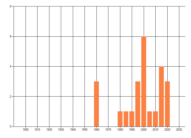 Het aantal atlasblokken (5x5 km) waarin de soort is gemeld binnen een periode van vijf jaar (vanaf 1980) of twintig jaar. Niet gecorrigeerd voor waarnemersinspanning en het aantal doorgegeven waarnemingen kan sterk variëren per periode, dus een trend in verspreiding kan hier niet direct uit worden afgelezen. Het opgegeven jaartal is het eerste jaar van de periode. Bron: gevalideerde waarnemingen uit de NDFF.