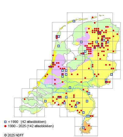 Het aantal atlasblokken (5x5 km) waarin de soort is gemeld binnen een periode van vijf jaar (vanaf 1980) of twintig jaar. Niet gecorrigeerd voor waarnemersinspanning en het aantal doorgegeven waarnemingen kan sterk variëren per periode, dus een trend in verspreiding kan hier niet direct uit worden afgelezen. Het opgegeven jaartal is het eerste jaar van de periode. Bron: gevalideerde waarnemingen uit de NDFF.