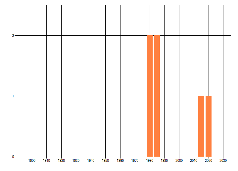 Het aantal atlasblokken (5x5 km) waarin de soort is gemeld binnen een periode van vijf jaar (vanaf 1980) of twintig jaar. Niet gecorrigeerd voor waarnemersinspanning en het aantal doorgegeven waarnemingen kan sterk variëren per periode, dus een trend in verspreiding kan hier niet direct uit worden afgelezen. Het opgegeven jaartal is het eerste jaar van de periode. Bron: gevalideerde waarnemingen uit de NDFF.