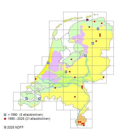 Het aantal atlasblokken (5x5 km) waarin de soort is gemeld binnen een periode van vijf jaar (vanaf 1980) of twintig jaar. Niet gecorrigeerd voor waarnemersinspanning en het aantal doorgegeven waarnemingen kan sterk variëren per periode, dus een trend in verspreiding kan hier niet direct uit worden afgelezen. Het opgegeven jaartal is het eerste jaar van de periode. Bron: gevalideerde waarnemingen uit de NDFF.