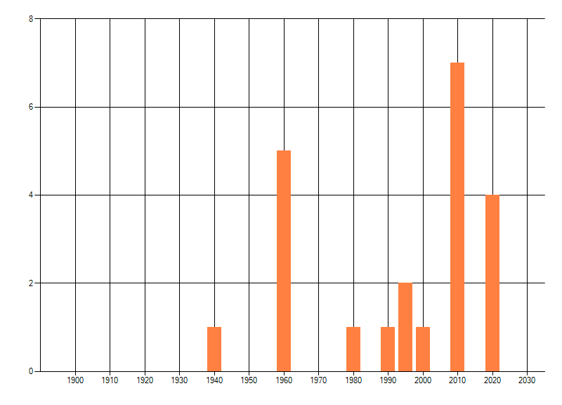 Het aantal atlasblokken (5x5 km) waarin de soort is gemeld binnen een periode van vijf jaar (vanaf 1980) of twintig jaar. Niet gecorrigeerd voor waarnemersinspanning en het aantal doorgegeven waarnemingen kan sterk variëren per periode, dus een trend in verspreiding kan hier niet direct uit worden afgelezen. Het opgegeven jaartal is het eerste jaar van de periode. Bron: gevalideerde waarnemingen uit de NDFF.