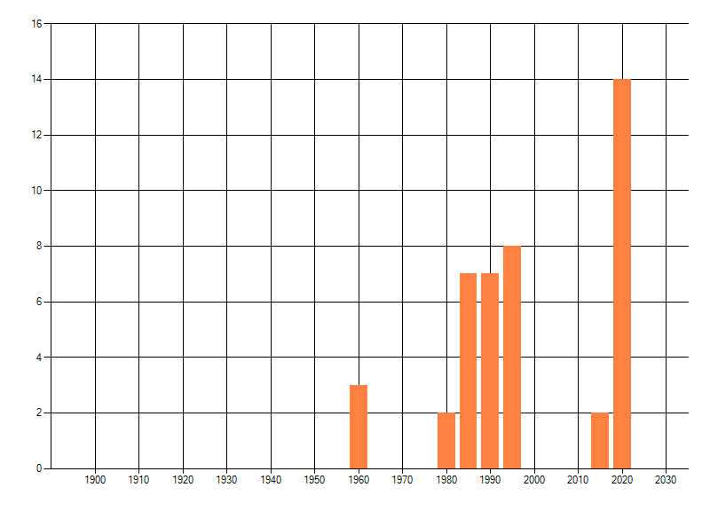 Het aantal atlasblokken (5x5 km) waarin de soort is gemeld binnen een periode van vijf jaar (vanaf 1980) of twintig jaar. Niet gecorrigeerd voor waarnemersinspanning en het aantal doorgegeven waarnemingen kan sterk variëren per periode, dus een trend in verspreiding kan hier niet direct uit worden afgelezen. Het opgegeven jaartal is het eerste jaar van de periode. Bron: gevalideerde waarnemingen uit de NDFF.