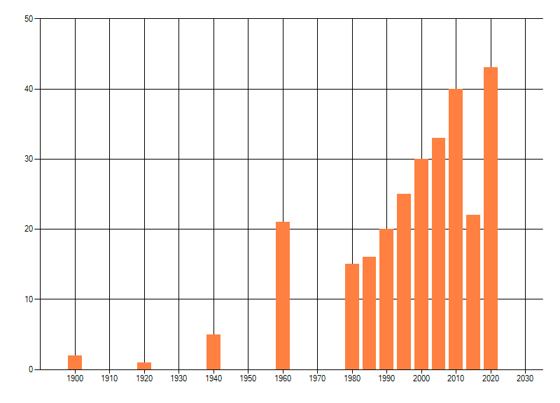 Het aantal atlasblokken (5x5 km) waarin de soort is gemeld binnen een periode van vijf jaar (vanaf 1980) of twintig jaar. Niet gecorrigeerd voor waarnemersinspanning en het aantal doorgegeven waarnemingen kan sterk variëren per periode, dus een trend in verspreiding kan hier niet direct uit worden afgelezen. Het opgegeven jaartal is het eerste jaar van de periode. Bron: gevalideerde waarnemingen uit de NDFF.