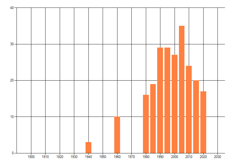 Het aantal atlasblokken (5x5 km) waarin de soort is gemeld binnen een periode van vijf jaar (vanaf 1980) of twintig jaar. Niet gecorrigeerd voor waarnemersinspanning en het aantal doorgegeven waarnemingen kan sterk variëren per periode, dus een trend in verspreiding kan hier niet direct uit worden afgelezen. Het opgegeven jaartal is het eerste jaar van de periode. Bron: gevalideerde waarnemingen uit de NDFF.