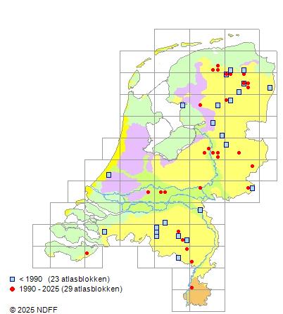 Het aantal atlasblokken (5x5 km) waarin de soort is gemeld binnen een periode van vijf jaar (vanaf 1980) of twintig jaar. Niet gecorrigeerd voor waarnemersinspanning en het aantal doorgegeven waarnemingen kan sterk variëren per periode, dus een trend in verspreiding kan hier niet direct uit worden afgelezen. Het opgegeven jaartal is het eerste jaar van de periode. Bron: gevalideerde waarnemingen uit de NDFF.