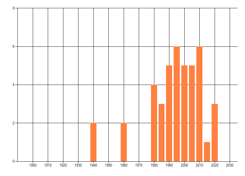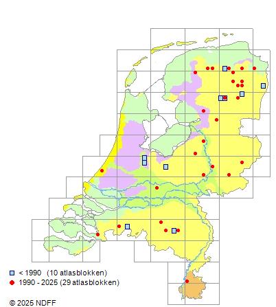 Het aantal atlasblokken (5x5 km) waarin de soort is gemeld binnen een periode van vijf jaar (vanaf 1980) of twintig jaar. Niet gecorrigeerd voor waarnemersinspanning en het aantal doorgegeven waarnemingen kan sterk variëren per periode, dus een trend in verspreiding kan hier niet direct uit worden afgelezen. Het opgegeven jaartal is het eerste jaar van de periode. Bron: gevalideerde waarnemingen uit de NDFF.