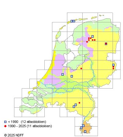 Het aantal atlasblokken (5x5 km) waarin de soort is gemeld binnen een periode van vijf jaar (vanaf 1980) of twintig jaar. Niet gecorrigeerd voor waarnemersinspanning en het aantal doorgegeven waarnemingen kan sterk variëren per periode, dus een trend in verspreiding kan hier niet direct uit worden afgelezen. Het opgegeven jaartal is het eerste jaar van de periode. Bron: gevalideerde waarnemingen uit de NDFF.