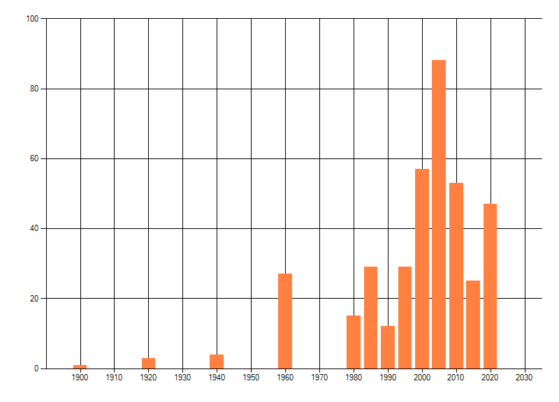 Het aantal atlasblokken (5x5 km) waarin de soort is gemeld binnen een periode van vijf jaar (vanaf 1980) of twintig jaar. Niet gecorrigeerd voor waarnemersinspanning en het aantal doorgegeven waarnemingen kan sterk variëren per periode, dus een trend in verspreiding kan hier niet direct uit worden afgelezen. Het opgegeven jaartal is het eerste jaar van de periode. Bron: gevalideerde waarnemingen uit de NDFF.