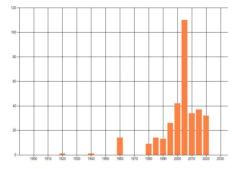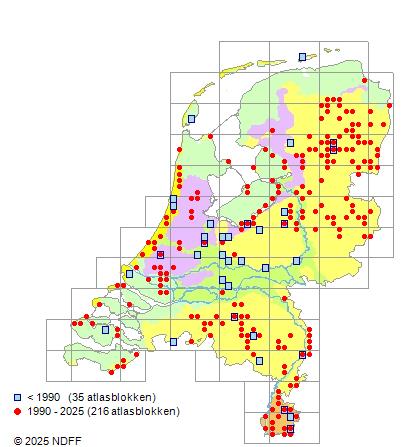 Het aantal atlasblokken (5x5 km) waarin de soort is gemeld binnen een periode van vijf jaar (vanaf 1980) of twintig jaar. Niet gecorrigeerd voor waarnemersinspanning en het aantal doorgegeven waarnemingen kan sterk variëren per periode, dus een trend in verspreiding kan hier niet direct uit worden afgelezen. Het opgegeven jaartal is het eerste jaar van de periode. Bron: gevalideerde waarnemingen uit de NDFF.