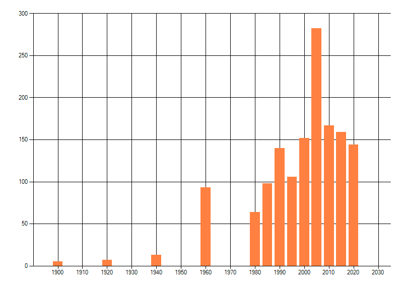 Het aantal atlasblokken (5x5 km) waarin de soort is gemeld binnen een periode van vijf jaar (vanaf 1980) of twintig jaar. Niet gecorrigeerd voor waarnemersinspanning en het aantal doorgegeven waarnemingen kan sterk variëren per periode, dus een trend in verspreiding kan hier niet direct uit worden afgelezen. Het opgegeven jaartal is het eerste jaar van de periode. Bron: gevalideerde waarnemingen uit de NDFF.