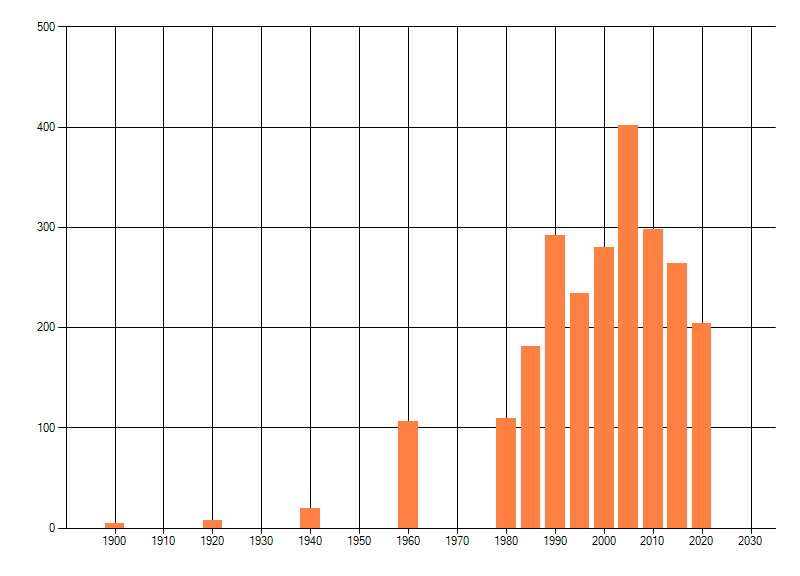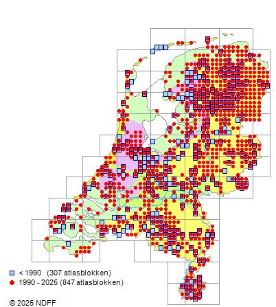 Het aantal atlasblokken (5x5 km) waarin de soort is gemeld binnen een periode van vijf jaar (vanaf 1980) of twintig jaar. Niet gecorrigeerd voor waarnemersinspanning en het aantal doorgegeven waarnemingen kan sterk variëren per periode, dus een trend in verspreiding kan hier niet direct uit worden afgelezen. Het opgegeven jaartal is het eerste jaar van de periode. Bron: gevalideerde waarnemingen uit de NDFF.
