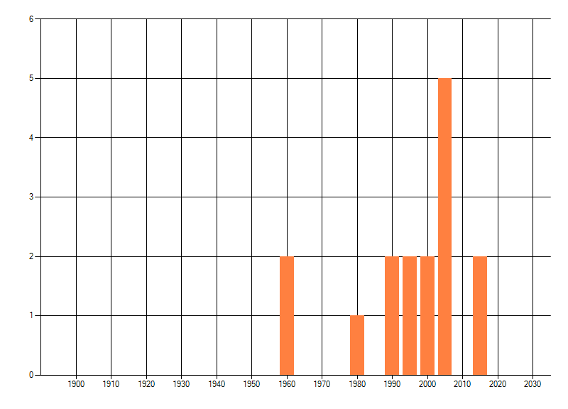Het aantal atlasblokken (5x5 km) waarin de soort is gemeld binnen een periode van vijf jaar (vanaf 1980) of twintig jaar. Niet gecorrigeerd voor waarnemersinspanning en het aantal doorgegeven waarnemingen kan sterk variëren per periode, dus een trend in verspreiding kan hier niet direct uit worden afgelezen. Het opgegeven jaartal is het eerste jaar van de periode. Bron: gevalideerde waarnemingen uit de NDFF.