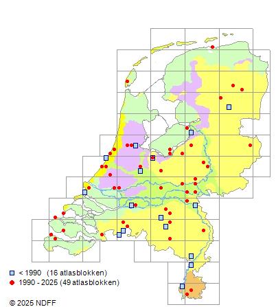 Het aantal atlasblokken (5x5 km) waarin de soort is gemeld binnen een periode van vijf jaar (vanaf 1980) of twintig jaar. Niet gecorrigeerd voor waarnemersinspanning en het aantal doorgegeven waarnemingen kan sterk variëren per periode, dus een trend in verspreiding kan hier niet direct uit worden afgelezen. Het opgegeven jaartal is het eerste jaar van de periode. Bron: gevalideerde waarnemingen uit de NDFF.