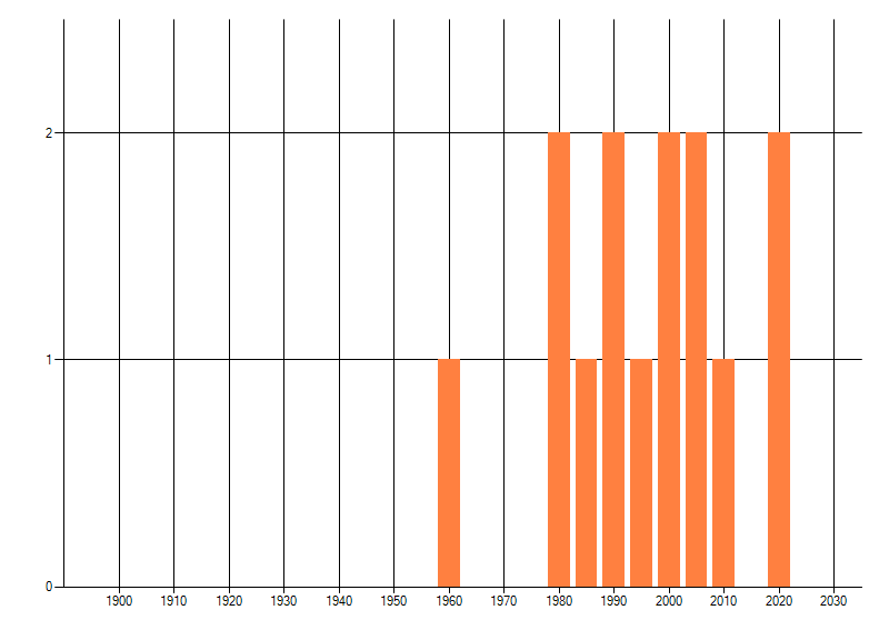 Het aantal atlasblokken (5x5 km) waarin de soort is gemeld binnen een periode van vijf jaar (vanaf 1980) of twintig jaar. Niet gecorrigeerd voor waarnemersinspanning en het aantal doorgegeven waarnemingen kan sterk variëren per periode, dus een trend in verspreiding kan hier niet direct uit worden afgelezen. Het opgegeven jaartal is het eerste jaar van de periode. Bron: gevalideerde waarnemingen uit de NDFF.