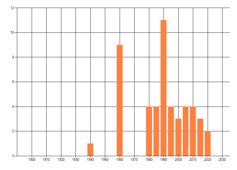 Het aantal atlasblokken (5x5 km) waarin de soort is gemeld binnen een periode van vijf jaar (vanaf 1980) of twintig jaar. Niet gecorrigeerd voor waarnemersinspanning en het aantal doorgegeven waarnemingen kan sterk variëren per periode, dus een trend in verspreiding kan hier niet direct uit worden afgelezen. Het opgegeven jaartal is het eerste jaar van de periode. Bron: gevalideerde waarnemingen uit de NDFF.