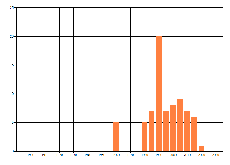 Het aantal atlasblokken (5x5 km) waarin de soort is gemeld binnen een periode van vijf jaar (vanaf 1980) of twintig jaar. Niet gecorrigeerd voor waarnemersinspanning en het aantal doorgegeven waarnemingen kan sterk variëren per periode, dus een trend in verspreiding kan hier niet direct uit worden afgelezen. Het opgegeven jaartal is het eerste jaar van de periode. Bron: gevalideerde waarnemingen uit de NDFF.
