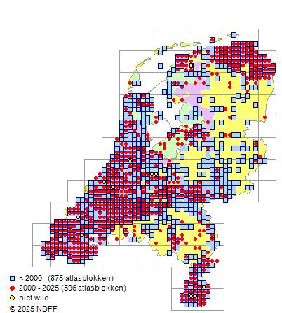 CC BY-NC-SA 3.0 NLVerspreidingNederlandVrij algemeen in Zuid-Limburg, in het westen van het land, in het noordelijk zeekleigebied en in het rivierengebied. Elders zeldzaam.