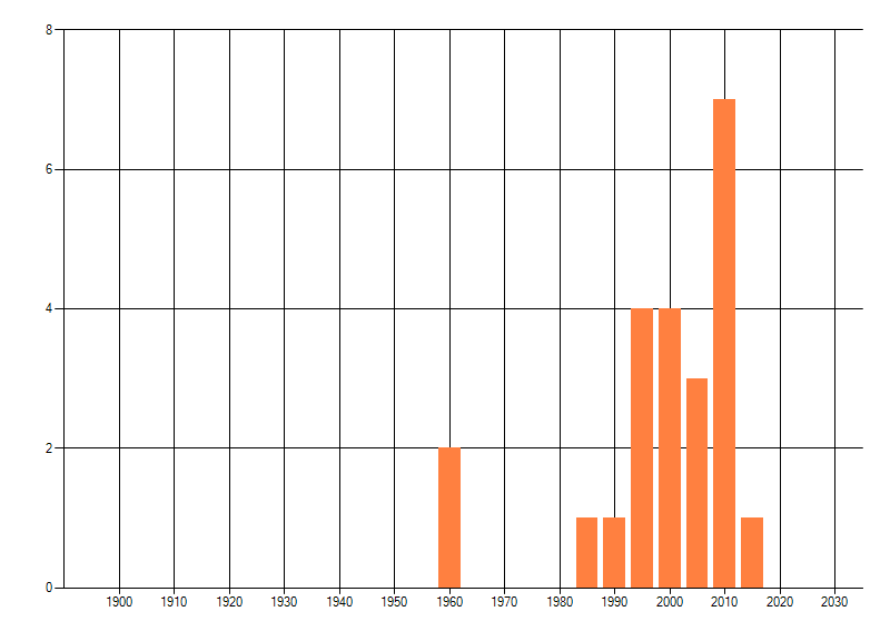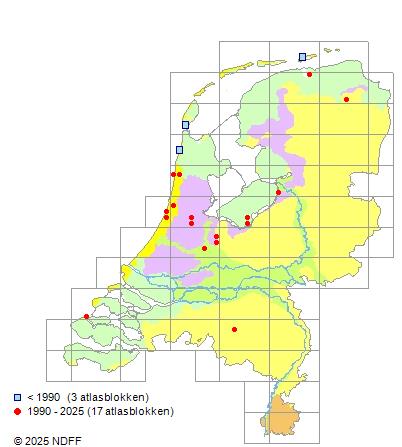 Het aantal atlasblokken (5x5 km) waarin de soort is gemeld binnen een periode van vijf jaar (vanaf 1980) of twintig jaar. Niet gecorrigeerd voor waarnemersinspanning en het aantal doorgegeven waarnemingen kan sterk variëren per periode, dus een trend in verspreiding kan hier niet direct uit worden afgelezen. Het opgegeven jaartal is het eerste jaar van de periode. Bron: gevalideerde waarnemingen uit de NDFF.