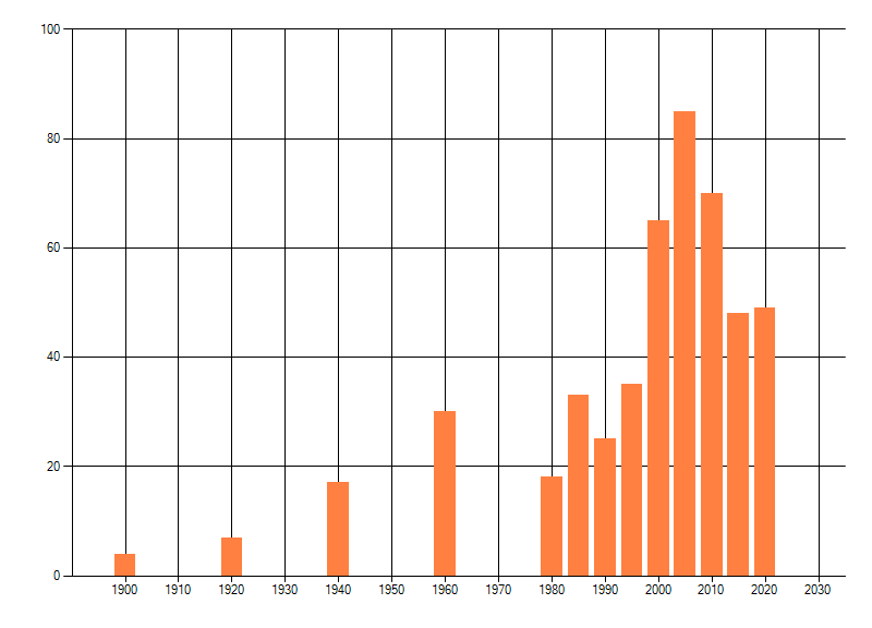 Het aantal atlasblokken (5x5 km) waarin de soort is gemeld binnen een periode van vijf jaar (vanaf 1980) of twintig jaar. Niet gecorrigeerd voor waarnemersinspanning en het aantal doorgegeven waarnemingen kan sterk variëren per periode, dus een trend in verspreiding kan hier niet direct uit worden afgelezen. Het opgegeven jaartal is het eerste jaar van de periode. Bron: gevalideerde waarnemingen uit de NDFF.