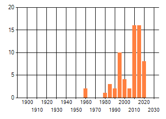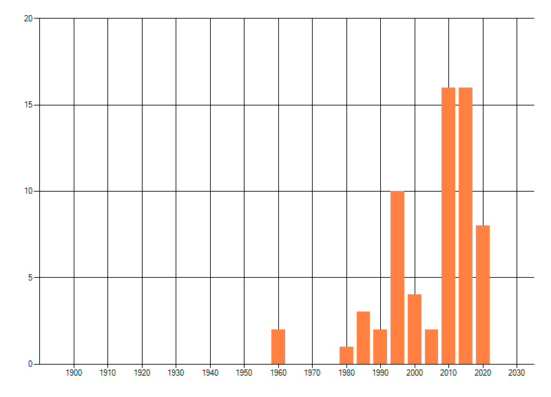 Het aantal atlasblokken (5x5 km) waarin de soort is gemeld binnen een periode van vijf jaar (vanaf 1980) of twintig jaar. Niet gecorrigeerd voor waarnemersinspanning en het aantal doorgegeven waarnemingen kan sterk variëren per periode, dus een trend in verspreiding kan hier niet direct uit worden afgelezen. Het opgegeven jaartal is het eerste jaar van de periode. Bron: gevalideerde waarnemingen uit de NDFF.