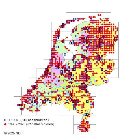 Het aantal atlasblokken (5x5 km) waarin de soort is gemeld binnen een periode van vijf jaar (vanaf 1980) of twintig jaar. Niet gecorrigeerd voor waarnemersinspanning en het aantal doorgegeven waarnemingen kan sterk variëren per periode, dus een trend in verspreiding kan hier niet direct uit worden afgelezen. Het opgegeven jaartal is het eerste jaar van de periode. Bron: gevalideerde waarnemingen uit de NDFF.