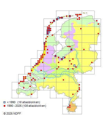Het aantal atlasblokken (5x5 km) waarin de soort is gemeld binnen een periode van vijf jaar (vanaf 1980) of twintig jaar. Niet gecorrigeerd voor waarnemersinspanning en het aantal doorgegeven waarnemingen kan sterk variëren per periode, dus een trend in verspreiding kan hier niet direct uit worden afgelezen. Het opgegeven jaartal is het eerste jaar van de periode. Bron: gevalideerde waarnemingen uit de NDFF.