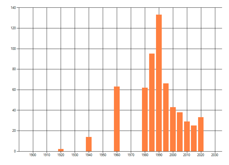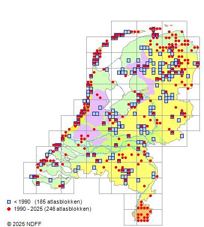 Het aantal atlasblokken (5x5 km) waarin de soort is gemeld binnen een periode van vijf jaar (vanaf 1980) of twintig jaar. Niet gecorrigeerd voor waarnemersinspanning en het aantal doorgegeven waarnemingen kan sterk variëren per periode, dus een trend in verspreiding kan hier niet direct uit worden afgelezen. Het opgegeven jaartal is het eerste jaar van de periode. Bron: gevalideerde waarnemingen uit de NDFF.
