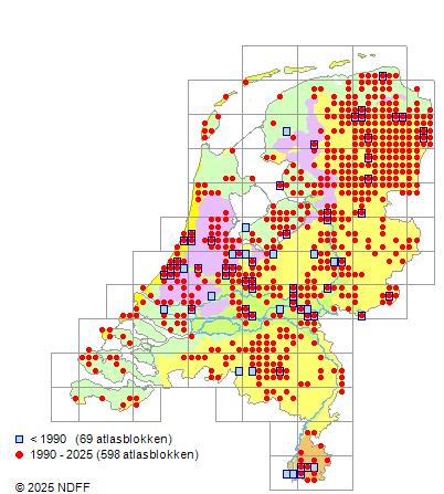 Het aantal atlasblokken (5x5 km) waarin de soort is gemeld binnen een periode van vijf jaar (vanaf 1980) of twintig jaar. Niet gecorrigeerd voor waarnemersinspanning en het aantal doorgegeven waarnemingen kan sterk variëren per periode, dus een trend in verspreiding kan hier niet direct uit worden afgelezen. Het opgegeven jaartal is het eerste jaar van de periode. Bron: gevalideerde waarnemingen uit de NDFF.