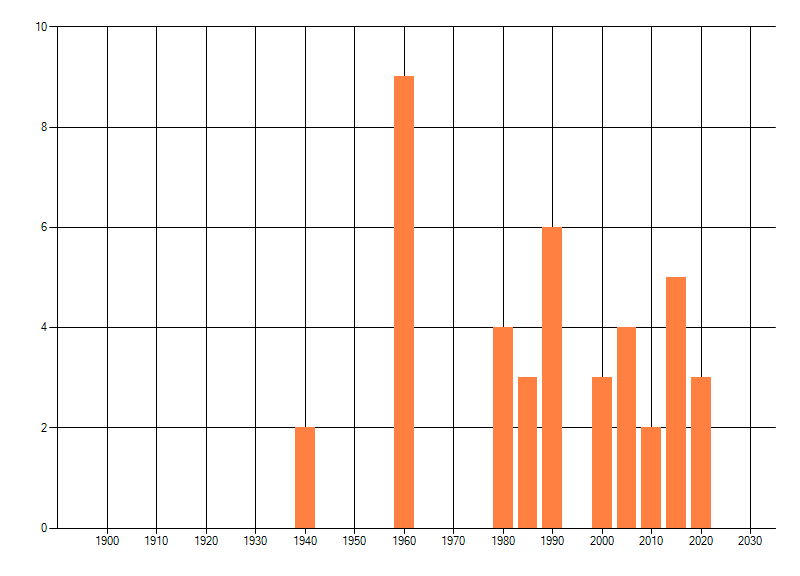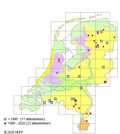 Het aantal atlasblokken (5x5 km) waarin de soort is gemeld binnen een periode van vijf jaar (vanaf 1980) of twintig jaar. Niet gecorrigeerd voor waarnemersinspanning en het aantal doorgegeven waarnemingen kan sterk variëren per periode, dus een trend in verspreiding kan hier niet direct uit worden afgelezen. Het opgegeven jaartal is het eerste jaar van de periode. Bron: gevalideerde waarnemingen uit de NDFF.