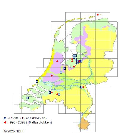 Het aantal atlasblokken (5x5 km) waarin de soort is gemeld binnen een periode van vijf jaar (vanaf 1980) of twintig jaar. Niet gecorrigeerd voor waarnemersinspanning en het aantal doorgegeven waarnemingen kan sterk variëren per periode, dus een trend in verspreiding kan hier niet direct uit worden afgelezen. Het opgegeven jaartal is het eerste jaar van de periode. Bron: gevalideerde waarnemingen uit de NDFF.