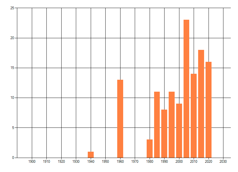 Het aantal atlasblokken (5x5 km) waarin de soort is gemeld binnen een periode van vijf jaar (vanaf 1980) of twintig jaar. Niet gecorrigeerd voor waarnemersinspanning en het aantal doorgegeven waarnemingen kan sterk variëren per periode, dus een trend in verspreiding kan hier niet direct uit worden afgelezen. Het opgegeven jaartal is het eerste jaar van de periode. Bron: gevalideerde waarnemingen uit de NDFF.