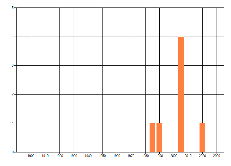 Het aantal atlasblokken (5x5 km) waarin de soort is gemeld binnen een periode van vijf jaar (vanaf 1980) of twintig jaar. Niet gecorrigeerd voor waarnemersinspanning en het aantal doorgegeven waarnemingen kan sterk variëren per periode, dus een trend in verspreiding kan hier niet direct uit worden afgelezen. Het opgegeven jaartal is het eerste jaar van de periode. Bron: gevalideerde waarnemingen uit de NDFF.