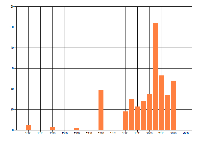 Het aantal atlasblokken (5x5 km) waarin de soort is gemeld binnen een periode van vijf jaar (vanaf 1980) of twintig jaar. Niet gecorrigeerd voor waarnemersinspanning en het aantal doorgegeven waarnemingen kan sterk variëren per periode, dus een trend in verspreiding kan hier niet direct uit worden afgelezen. Het opgegeven jaartal is het eerste jaar van de periode. Bron: gevalideerde waarnemingen uit de NDFF.