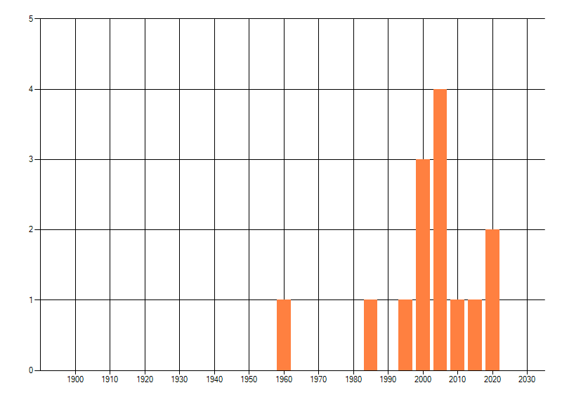 Het aantal atlasblokken (5x5 km) waarin de soort is gemeld binnen een periode van vijf jaar (vanaf 1980) of twintig jaar. Niet gecorrigeerd voor waarnemersinspanning en het aantal doorgegeven waarnemingen kan sterk variëren per periode, dus een trend in verspreiding kan hier niet direct uit worden afgelezen. Het opgegeven jaartal is het eerste jaar van de periode. Bron: gevalideerde waarnemingen uit de NDFF.