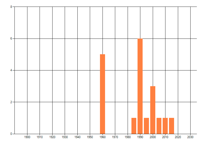 Het aantal atlasblokken (5x5 km) waarin de soort is gemeld binnen een periode van vijf jaar (vanaf 1980) of twintig jaar. Niet gecorrigeerd voor waarnemersinspanning en het aantal doorgegeven waarnemingen kan sterk variëren per periode, dus een trend in verspreiding kan hier niet direct uit worden afgelezen. Het opgegeven jaartal is het eerste jaar van de periode. Bron: gevalideerde waarnemingen uit de NDFF.