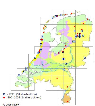 Het aantal atlasblokken (5x5 km) waarin de soort is gemeld binnen een periode van vijf jaar (vanaf 1980) of twintig jaar. Niet gecorrigeerd voor waarnemersinspanning en het aantal doorgegeven waarnemingen kan sterk variëren per periode, dus een trend in verspreiding kan hier niet direct uit worden afgelezen. Het opgegeven jaartal is het eerste jaar van de periode. Bron: gevalideerde waarnemingen uit de NDFF.