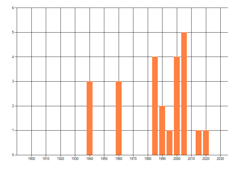 Het aantal atlasblokken (5x5 km) waarin de soort is gemeld binnen een periode van vijf jaar (vanaf 1980) of twintig jaar. Niet gecorrigeerd voor waarnemersinspanning en het aantal doorgegeven waarnemingen kan sterk variëren per periode, dus een trend in verspreiding kan hier niet direct uit worden afgelezen. Het opgegeven jaartal is het eerste jaar van de periode. Bron: gevalideerde waarnemingen uit de NDFF.