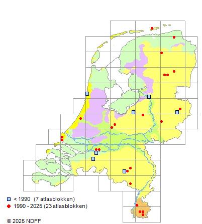 Het aantal atlasblokken (5x5 km) waarin de soort is gemeld binnen een periode van vijf jaar (vanaf 1980) of twintig jaar. Niet gecorrigeerd voor waarnemersinspanning en het aantal doorgegeven waarnemingen kan sterk variëren per periode, dus een trend in verspreiding kan hier niet direct uit worden afgelezen. Het opgegeven jaartal is het eerste jaar van de periode. Bron: gevalideerde waarnemingen uit de NDFF.
