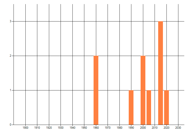 Het aantal atlasblokken (5x5 km) waarin de soort is gemeld binnen een periode van vijf jaar (vanaf 1980) of twintig jaar. Niet gecorrigeerd voor waarnemersinspanning en het aantal doorgegeven waarnemingen kan sterk variëren per periode, dus een trend in verspreiding kan hier niet direct uit worden afgelezen. Het opgegeven jaartal is het eerste jaar van de periode. Bron: gevalideerde waarnemingen uit de NDFF.