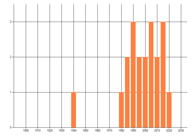Het aantal atlasblokken (5x5 km) waarin de soort is gemeld binnen een periode van vijf jaar (vanaf 1980) of twintig jaar. Niet gecorrigeerd voor waarnemersinspanning en het aantal doorgegeven waarnemingen kan sterk variëren per periode, dus een trend in verspreiding kan hier niet direct uit worden afgelezen. Het opgegeven jaartal is het eerste jaar van de periode. Bron: gevalideerde waarnemingen uit de NDFF.