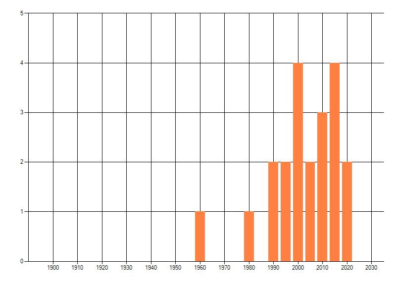 Het aantal atlasblokken (5x5 km) waarin de soort is gemeld binnen een periode van vijf jaar (vanaf 1980) of twintig jaar. Niet gecorrigeerd voor waarnemersinspanning en het aantal doorgegeven waarnemingen kan sterk variëren per periode, dus een trend in verspreiding kan hier niet direct uit worden afgelezen. Het opgegeven jaartal is het eerste jaar van de periode. Bron: gevalideerde waarnemingen uit de NDFF.