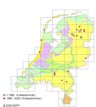 Het aantal atlasblokken (5x5 km) waarin de soort is gemeld binnen een periode van vijf jaar (vanaf 1980) of twintig jaar. Niet gecorrigeerd voor waarnemersinspanning en het aantal doorgegeven waarnemingen kan sterk variëren per periode, dus een trend in verspreiding kan hier niet direct uit worden afgelezen. Het opgegeven jaartal is het eerste jaar van de periode. Bron: gevalideerde waarnemingen uit de NDFF.