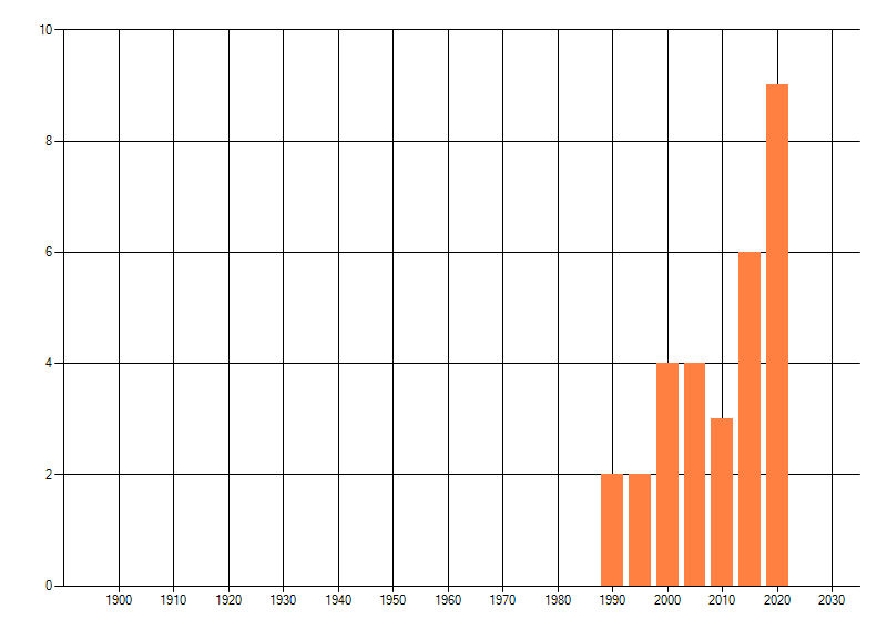 Het aantal atlasblokken (5x5 km) waarin de soort is gemeld binnen een periode van vijf jaar (vanaf 1980) of twintig jaar. Niet gecorrigeerd voor waarnemersinspanning en het aantal doorgegeven waarnemingen kan sterk variëren per periode, dus een trend in verspreiding kan hier niet direct uit worden afgelezen. Het opgegeven jaartal is het eerste jaar van de periode. Bron: gevalideerde waarnemingen uit de NDFF.
