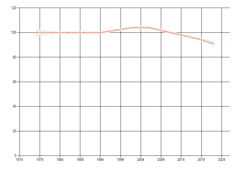 Gemiddelde trend van het aantal kilometerhokken waarin de soort voorkomt, weergegeven als indexcijfer (1975-1978 = 100).