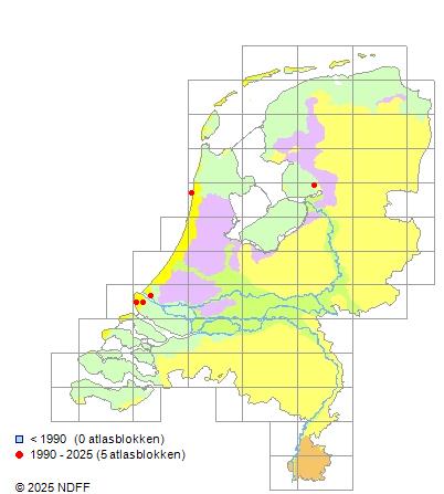 Het aantal atlasblokken (5x5 km) waarin de soort is gemeld binnen een periode van vijf jaar (vanaf 1980) of twintig jaar. Niet gecorrigeerd voor waarnemersinspanning en het aantal doorgegeven waarnemingen kan sterk variëren per periode, dus een trend in verspreiding kan hier niet direct uit worden afgelezen. Het opgegeven jaartal is het eerste jaar van de periode. Bron: gevalideerde waarnemingen uit de NDFF.