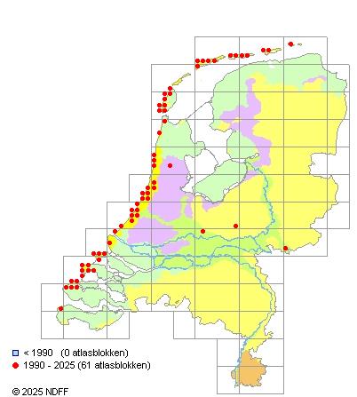 Het aantal atlasblokken (5x5 km) waarin de soort is gemeld binnen een periode van vijf jaar (vanaf 1980) of twintig jaar. Niet gecorrigeerd voor waarnemersinspanning en het aantal doorgegeven waarnemingen kan sterk variëren per periode, dus een trend in verspreiding kan hier niet direct uit worden afgelezen. Het opgegeven jaartal is het eerste jaar van de periode. Bron: gevalideerde waarnemingen uit de NDFF.