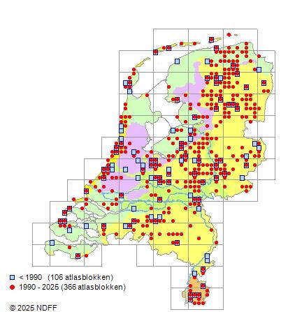 Het aantal atlasblokken (5x5 km) waarin de soort is gemeld binnen een periode van vijf jaar (vanaf 1980) of twintig jaar. Niet gecorrigeerd voor waarnemersinspanning en het aantal doorgegeven waarnemingen kan sterk variëren per periode, dus een trend in verspreiding kan hier niet direct uit worden afgelezen. Het opgegeven jaartal is het eerste jaar van de periode. Bron: gevalideerde waarnemingen uit de NDFF.