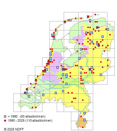 Het aantal atlasblokken (5x5 km) waarin de soort is gemeld binnen een periode van vijf jaar (vanaf 1980) of twintig jaar. Niet gecorrigeerd voor waarnemersinspanning en het aantal doorgegeven waarnemingen kan sterk variëren per periode, dus een trend in verspreiding kan hier niet direct uit worden afgelezen. Het opgegeven jaartal is het eerste jaar van de periode. Bron: gevalideerde waarnemingen uit de NDFF.