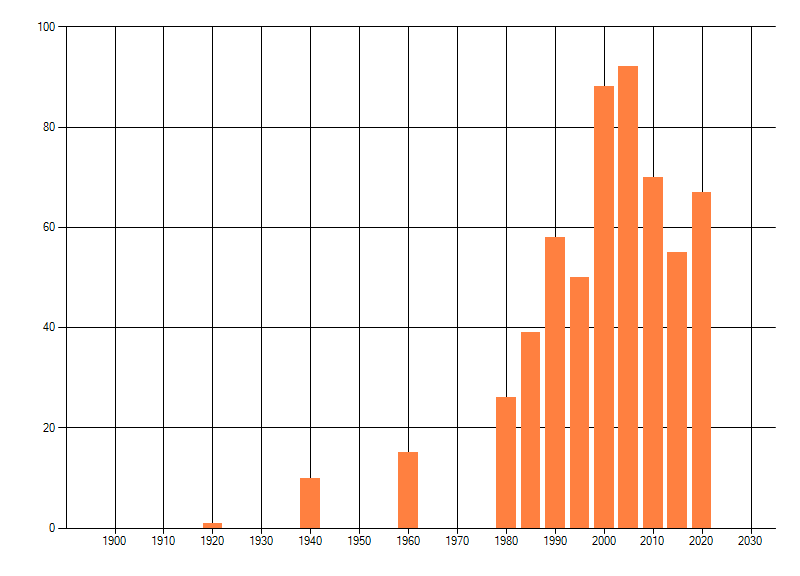 Het aantal atlasblokken (5x5 km) waarin de soort is gemeld binnen een periode van vijf jaar (vanaf 1980) of twintig jaar. Niet gecorrigeerd voor waarnemersinspanning en het aantal doorgegeven waarnemingen kan sterk variëren per periode, dus een trend in verspreiding kan hier niet direct uit worden afgelezen. Het opgegeven jaartal is het eerste jaar van de periode. Bron: gevalideerde waarnemingen uit de NDFF.